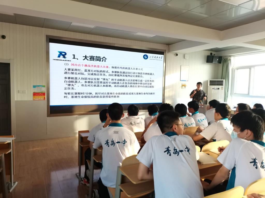 近日,beat365英国官方网站beat365英国官方网站SmartRobot机器人战队队长王雷带领电控组硬件方向组长李超凡、骨干成员孙振琪,电控组软件方向组长贾科研等人来到青岛一中创新社团,为青岛一中莘莘学子带来了别开生面的科创公开课。