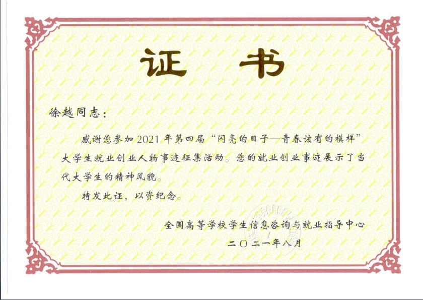 本次评选由教育部全国高等学校学生信息咨询与就业指导中心举办,经过学校初选申报、山东省教育厅复审推荐以及教育部遴选,我校选送的徐越同学在全省148名大学生就业创业人物事迹中脱颖而出,全省共有15名学生获此殊荣。据悉,入选的典型人物事迹将在全国高校学生信息咨询与就业指导中心官网专栏报道,在《中国大学生就业》杂志、新职业网、学信网、各省市就业指导中心网站刊发,并将出版发行。(通讯员:李雷 责编:徐展)