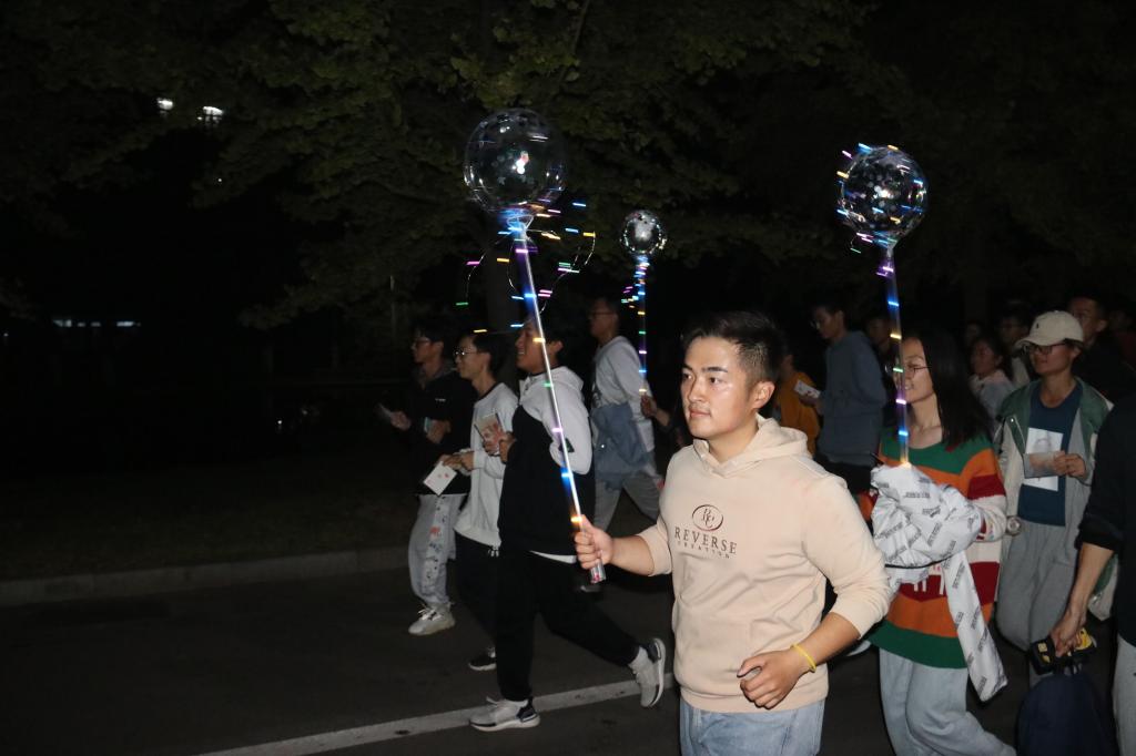 领跑人整理队伍,夜跑正式开始。本次活动从泰山广场出发,向东经过S1实验楼,整体呈环形路线,最终返回泰山广场,全长共计3公里。为了确保同学们夜跑途中的安全,领跑人用鲜明的标志物引领同学前进。在夜跑途中设有两个打卡点,同学们可以在打卡处盖章纪念并稍作休息调整。八点十分,跑步队伍回到泰山广场,夜跑活动也接近尾声。同学们在签到处有序领取交换物品并合影留念、有序签退,本次活动圆满结束。