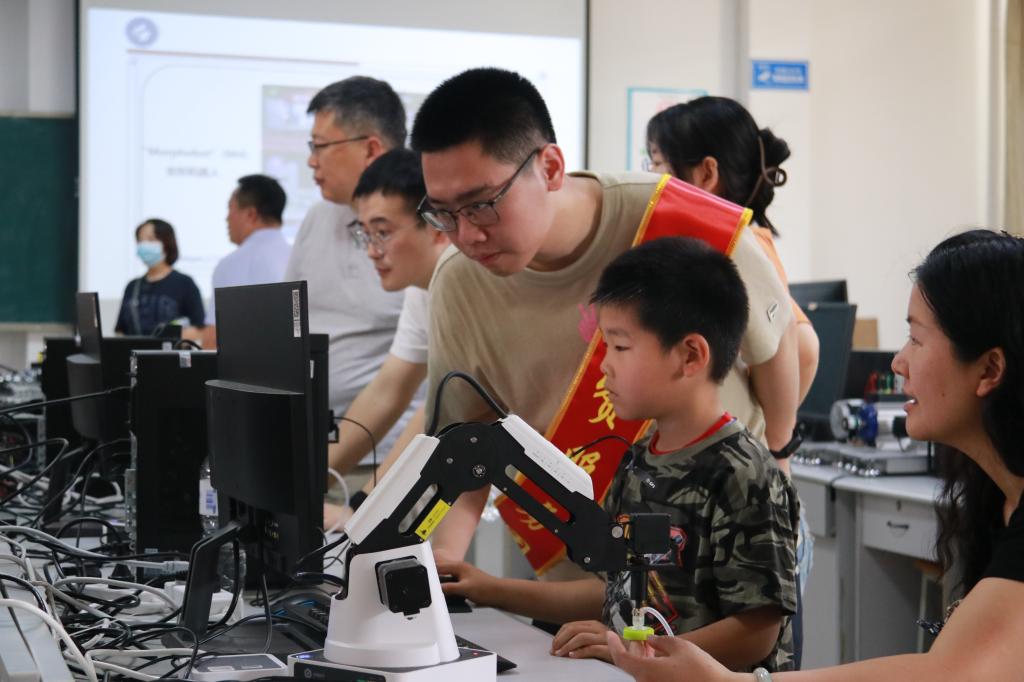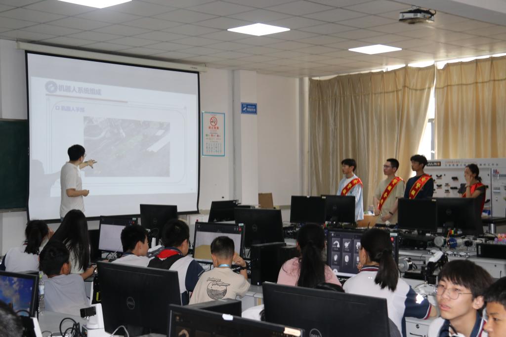 机器人研究中心副主任宋诗斌为中学生们深入浅出地讲解机器人的相关知识,帮助学生们初步认识机器人的结构和运行方式。随后,中学生们来到学院SmartRobot战队实验室,在老师和志愿者的带领讲解下,感受智能机器人的魅力,步兵机器人、哨兵机器人、英雄机器人......中学生们亲眼目睹并动手操作了各类机器人战车,并与战队青年工程师们进行互动交流,深入体验科技的魅力,激发他们对科技领域探索的热情。